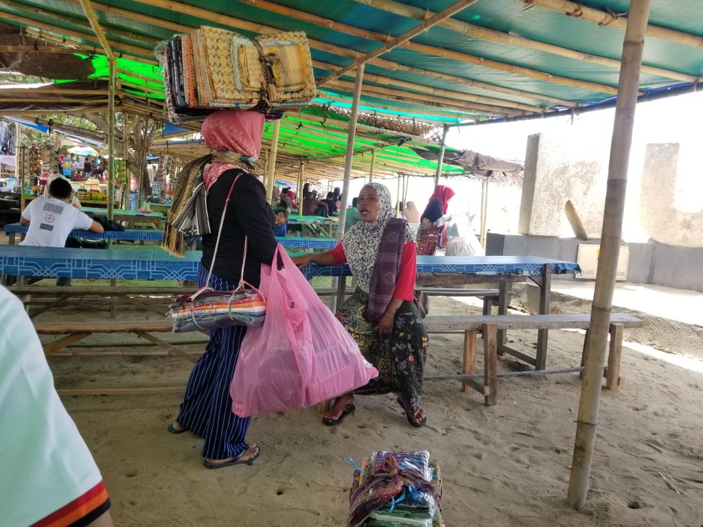 setelah sekitar 1 jam keliling desa sade, aku ada niatan beli tambahan gelang buat oleh oleh dari lombok di toko yang depannya buat parkir ini, kita ditawari lagi si kain tenun ini. Pertama buka harga 150rb, kaget dong, aku beli satu set kain tenun di dalem desa sade kena 350rb itu juga udah ditawar, nah ini dia buka harga 150rb, dengan barang yang sama, motif yang sama, dan semuanya sama harganya 50% lebih murah dari yang di dalem desa sade, ya karna kita di Mandalika tadi malem juga udah beli kain tenun, terus di delem desa sade juga kita beli kain tenun, nah akhirnya kita mulai nawar dengan jurus emak emak kalo kepasar, pertama aku tawar 150rb dapet 2 set, setelah dapet kita tawar lagi sampe akhirnya 200rb dapet 4 set, terus kita juga nawar sarung tenun lombok, 75rb dapet 2 biji, dan bagus loh bahannya, bukan bahan yang biasa sih menurutku.